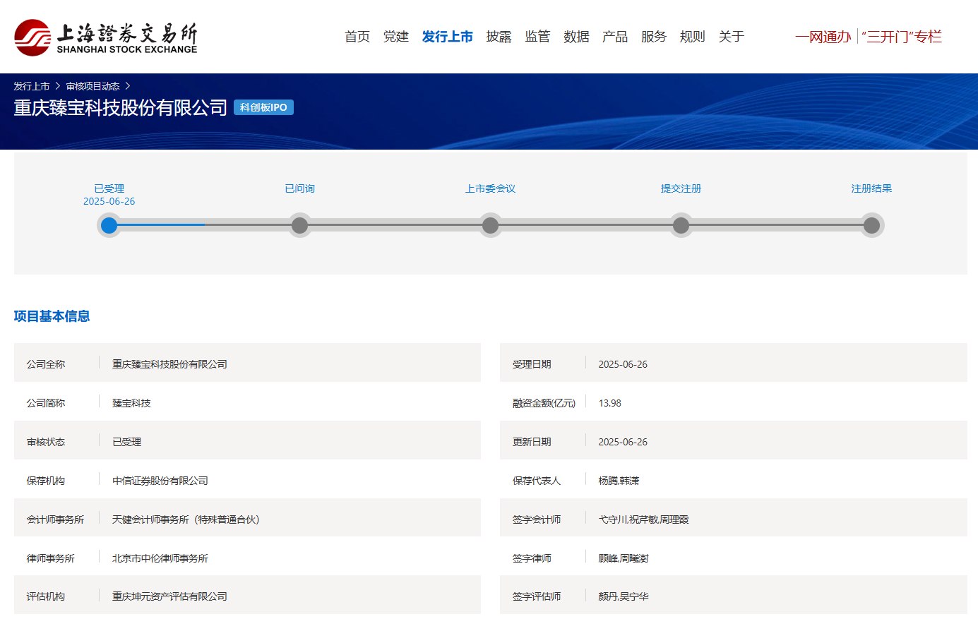 中國粉體網訊 近日,上交所官網顯示,重慶臻寶科技股份有限公司(簡稱:臻寶科技)科創板IPO申請獲受理。