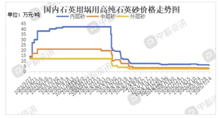 2024年,光伏行業(yè)產(chǎn)能集中釋放引發(fā)激烈競(jìng)爭(zhēng),產(chǎn)業(yè)鏈結(jié)構(gòu)性利潤(rùn)下滑逐步傳導(dǎo)至全鏈條,石英材料首當(dāng)其沖。從第二季度開始,高純石英砂價(jià)格開啟“自由落體”模式:國(guó)產(chǎn)外層砂、中層砂價(jià)格先“腰斬”,再“膝斬”。