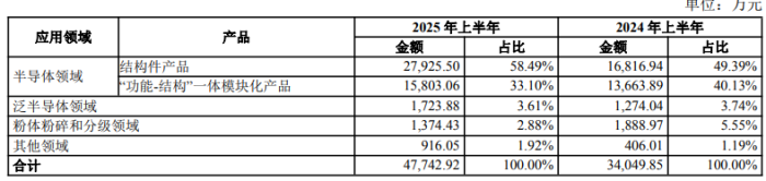 半導體領域是公司產品的主要應用方向,公司在2025年上半年及2024年同期來自半導體設備領域的先進陶瓷材料零部件收入分別為43,728.56萬元和30,480.83萬元,占先進陶瓷材料零部件收入的比例分別為91.59%和89.52%。