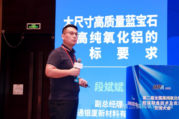 天通銀廈新材料有限公司副總經理段斌斌作《大尺寸高質量藍寶石對高純氧化鋁的指標要求》報告