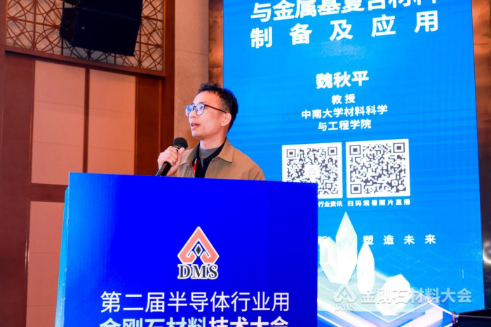 金剛石憑借超高熱導率,成為解決高功率電子器件散熱難題的理想選擇。魏秋平教授(黃開塘代)報告介紹了金剛石金屬復合材料及其在散熱領域的多研究進展,還提到了真空鍍膜技術及在金屬復合材料界面優化研究中的應用,并就復合材料規模化制備中面臨的界面缺陷控制及成本優化問題提出了解決方案。