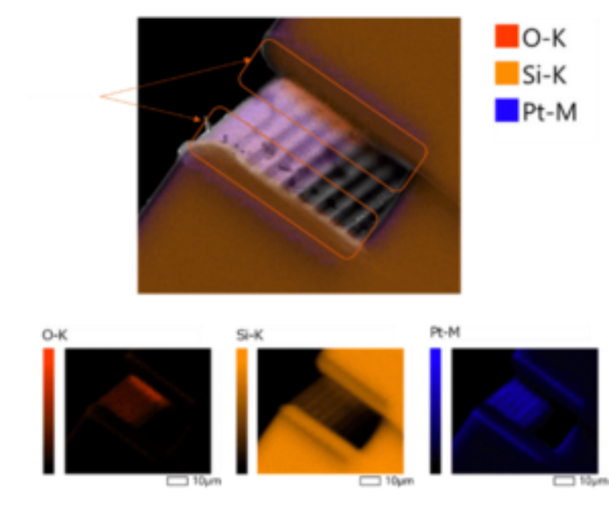 20 μm通道電容式傳感器鉑沉積的橫截面圖。EDX元素掃描結果表明,鉑沿側壁呈保形沉積