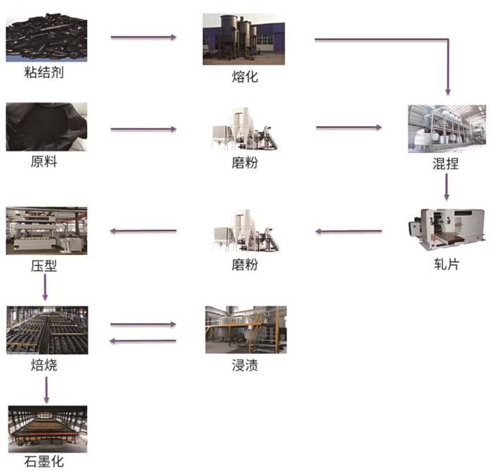 國內企業多采用多次浸漬和焙燒工藝,流程長、耗能耗時,國外公司多采用預處理技術、改性技術等自主研發的專用浸漬劑瀝青,喹啉不溶物含量低于1%,最多浸漬一次。另外,國內部分企業在開發不經過浸漬直接焙燒的一焙品直接石墨化技術,這是特種石墨生產工藝的一個巨大進步。
