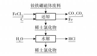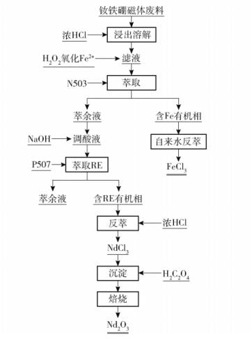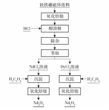 Wang等[9]采用鹽酸優(yōu)溶法回收釹鐵硼磁鐵廢料中的稀土元素,首先通過氧化焙燒將稀土轉(zhuǎn)化為氧化物,分次加入鹽酸鹽調(diào)整pH值使稀土氧化物轉(zhuǎn)化為稀土氯化物優(yōu)先溶解進入溶液,而氧化鐵則成為熔渣,從而將稀土氧化物與氧化鐵分離。將含稀土氯化物的溶液通過萃取分離制得單一的稀土氯化物,最后加入沉淀劑草酸,得到稀土草酸鹽沉淀,在1273K下對沉淀物進行焙燒得到釹氧化物,稀土回收率可達99%。