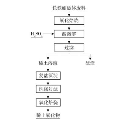 肖榮輝[10]于2001年提出從釹鐵硼磁體廢料中提取稀土元素的復(fù)鹽沉淀法,其流程如圖5所示。整個工藝通過使用硫酸來溶解氧化焙燒后的釹鐵硼廢料,然后在較高溫度下加入硫酸鈉與稀土元素反應(yīng),形成稀土復(fù)鹽沉淀,然后再加堿轉(zhuǎn)化,草酸沉淀稀土,最后灼燒得到稀土氧化物。