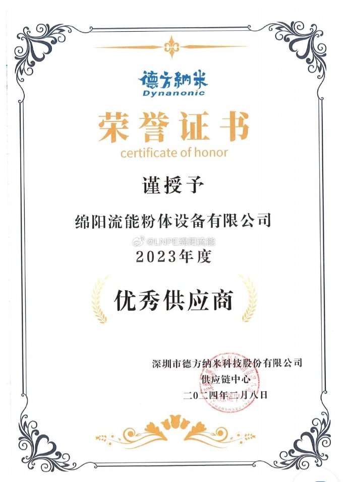 ?近日,綿陽流能憑借高品質的研發水平、生產工藝、產品品質和服務質量,獲得德方納米“優秀供應商”獎項。 綿陽流能粉體設備有限公司是一家行業領先的粉體裝備綜合服務商,公司以粉碎、輸送及顆粒表面修飾技術為 核心為客戶提供高端粉體成套加工裝備,同時提供從生產線設計、設備制造、安裝調試到投產交付的一體化粉體工程