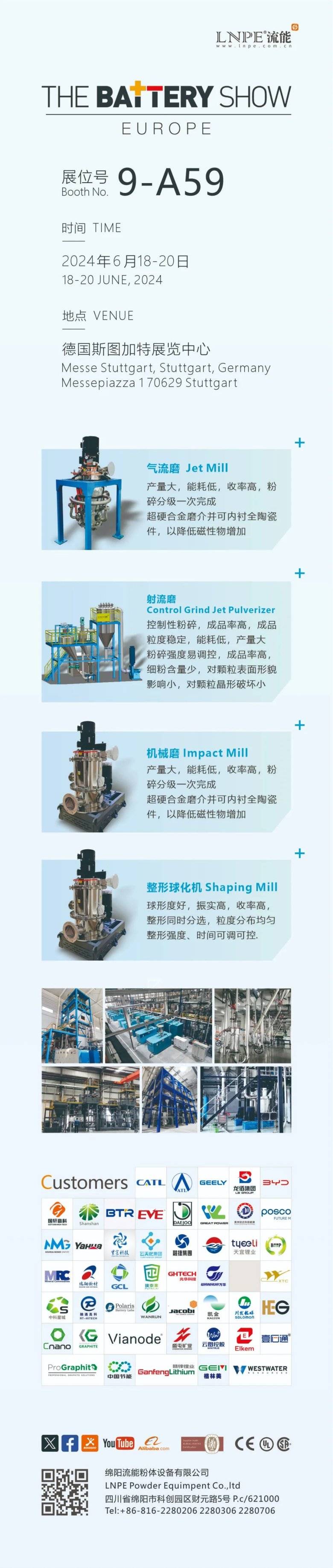 ?2024年歐洲電池展及電動車科技展 The Battery Show Europe,2024 年 6 月 18 至 20 日在德國新斯圖加特展覽中心 Messe Stuttgart舉行,600 家展商齊聚一堂。屆時,綿陽流能將展示氣流磨、射流磨、機械磨、整形球化機及電池產線。綿陽流能將在9號館“9-