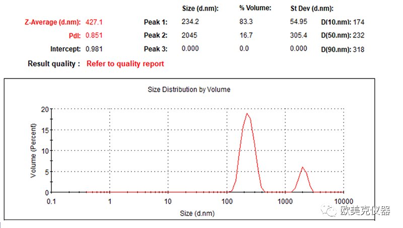 上圖中,激光粒度儀測試結果下圖納米粒度儀的結果是來自同一個樣品,從分布圖和數據重現程度上看,1μm以下,納米粒度儀分辨能力優于激光粒度儀;1μm以上顆粒的量的測試,激光粒度儀測試重現性優于納米粒度儀;同時對于這樣的少量較大顆粒,動態光散射納米粒度儀在技術上更敏感(測試的光能數據百分比更高)。