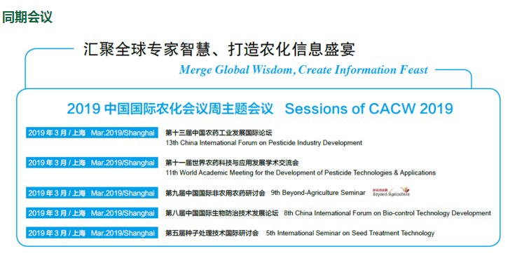 據悉,CAC--全球農化盛宴,自1999年首次舉辦,歷經十九屆的長足發展,已經成為全球最大的農用化學品展覽會,并于2012年獲得了UFI認證。CAC2019展會圍繞新常態、新領域、新機遇,通過展覽會、專業會議、新產品新技術發布等多種形式,緊扣行業發展脈搏,匯聚行業精英思考的精髓,以全球化視野下的戰略性眼光,引領行業發展新高度。第十三屆中國農藥工業發展國際論壇、第十一屆農藥科技與應用發展學術交流會等活動也將同期舉行。