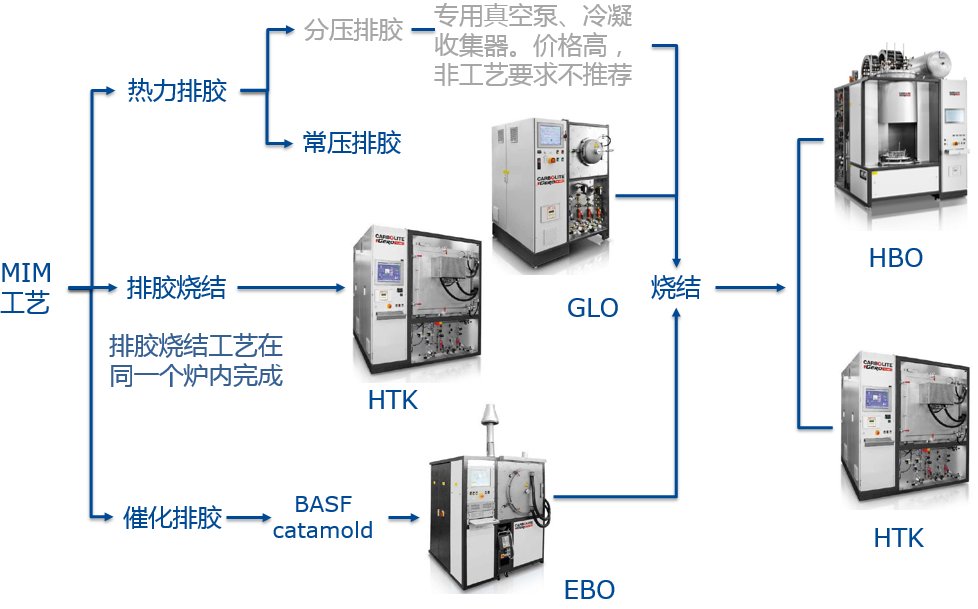 MIM/CIM工藝流程中,需要使用粘結劑,使其與金屬或陶瓷粉末混合成喂料方便成形。在燒結前需要去除這些粘接劑,這個過程叫排膠。排膠是否徹底,對成品的質量影響很大。Carbolite·Gero(卡博萊特·蓋羅)熱壁爐——GLO系列,能滿足此應用。其加熱元件位于爐膛外側,整個爐膛相當于一個容器。加熱元件直接加熱爐膛外側,并向內傳導熱量,整個爐膛壁是熱的,所以叫做熱壁爐,也可選配帶氫氣供氣系統的全自動控制系統。