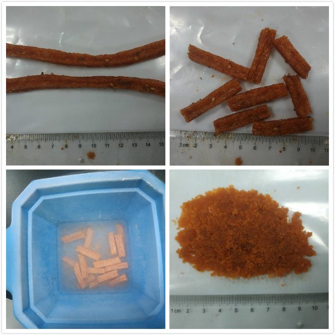 GM200的最大進樣尺寸40mm,GM300最大進樣尺寸130mm。對于辣條樣品來說,如果原始樣品的尺寸過大,可以先用剪刀對樣品剪成儀器要求的進樣尺寸。然后使用液氮對辣條進行脆化處理同時可對熱敏性成分進行保護,最后使用GM系列刀式研磨儀10s內即可實現非常好的粉碎處理效果。如圖為辣條樣品整個研磨過程,其中使用的是GM200刀式研磨儀,8000r/min、10s即可實現對辣條樣品的粉碎混勻。