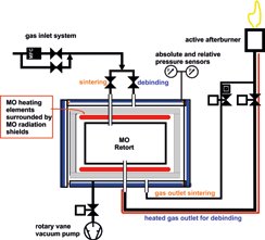 金屬增材制造(AM)可分為直接成型和間接成型兩種。間接增材制造工藝和粉末注塑成型工藝中(陶瓷注塑成型簡稱CIM,金屬注塑成型簡稱MIM),初始粉末需要和粘接劑充分混合,生坯成型后,粘合劑則需要通過加熱、催化或溶解等方法去除(會導致部件收縮),得到棕坯(brown Parts)后再燒結,使零件具有最終的形狀和性能。 當通過加熱等方式去除大部分粘合劑后,陶瓷或金屬粉末僅通過粘合劑的骨架結構粘合在一起,這使得該部件對環境要求較高。接下來需要將粘合劑骨架結構加熱去除并將該部件直接置于同一爐中燒結。陶瓷注塑成型CIM和金屬注塑成型MIM排膠過程需要去除揮發物并保證精確的溫度均勻性,以便燒結完好,達到其材料性能。排膠可以在真空、空氣或惰性氣氛下進行,惰性氣體通常用作載氣掃除揮發的粘合劑并縮短排膠時間。燒結過程需要具有特定氣氛的馬弗爐,可查詢CARBOLITE GERO(卡博萊特?蓋羅)產品手冊了解詳細信息。 CARBOLITE GERO(卡博萊特?蓋羅)的HTK高溫箱式爐非常適用于增材制造或粉末注塑件的骨架粘合劑排膠和燒結。其良好的溫度均勻性確保在整個腔室內進行精確的排膠和燒結。無論是在惰性或反應性氣氛下,或是高真空甚至超高真空下,其都可以滿足對環境要求極高的材料的燒結需求。 CARBOLITE GERO(卡博萊特?蓋羅)HTK高溫箱式爐矩形前門的設計便于裝樣和取樣,特別是對于僅含骨架結構粘合劑的易碎部件(之前已移除大部分粘合劑)。 HTK系列有四種不同尺寸,8升,25升,80升和200升。由鎢(W)或鉬(MO)構成的金屬爐膛內,確保高純度惰性氣氛或高真空度(5×10E-6 mbar),氣氛通常包括:氮氣,氬氣(鈦合金),氫氣(不銹鋼)或混合氣。 HTK系列加熱元件與保溫材料為相同的金屬材料制成,保溫材料由鎢或鉬制成的輻射屏蔽構成(根據所選擇的爐型)。HTK W的最高溫度為2200°C,HTK MO為1600°C。在排膠過程中產生的廢氣通過可加熱的廢氣管道排出,并在尾氣燃燒火炬中催化燃燒。 CARBOLITE GERO(卡博萊特?蓋羅)通過切換進氣方式實現對于環境要求較高的材料無污染燒結,如下圖所示。