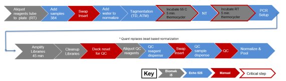 圖2. 微量化Illumina Nextera XT文庫制備的自動化流程。灰色代表Biomek i5完成步驟,藍色代表Echo 525完成步驟,紅色代表手工干預步驟。Echo用于反應體系構建及Normalization/pooling;Biomek配置384通道加樣器,并具有選擇性吸頭移液功能,用于分裝Echo所需試劑并進行產物純化;可選配臺面整合的PCR儀,用于PCR擴增和孵育,減少人為干預。