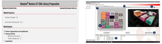 圖3.向導式的軟件操作界面(左),和臺面自動校對功能 (右)。如左圖所示,在軟件操作界面上用戶可以選擇樣本數量,是否使用臺面整合的PCR儀,以及運行工作流程的哪個部分。具備臺面自動校對功能(右圖),當操作人員完成耗材擺放后,工作站可自動判定耗材擺放是否正確,對錯誤擺放位置進行提示,確保程序運行前臺面擺放正確。避免由于人為擺放耗材錯誤,導致設備碰撞或試劑、時間損失。