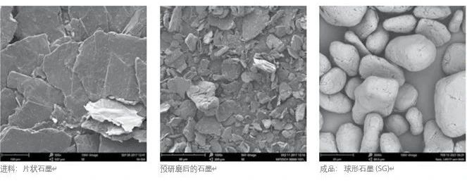 ?天然石墨和合成石墨都是片狀的,顯微鏡下呈現(xiàn)出明顯的層結(jié)構(gòu),而理想情況下鋰電池負(fù)極材料的生產(chǎn)需要用到球形石墨。所以,我們的工藝目標(biāo)是:獲得窄的粒徑分布,高堆積密度和總產(chǎn)率高的球形化成品。高效的石墨球形化工藝分為三個(gè)步驟:進(jìn)料,球形化和出料。在進(jìn)料階段,產(chǎn)品被大量輸送到工藝腔中。在球化階段,設(shè)備按照設(shè)置