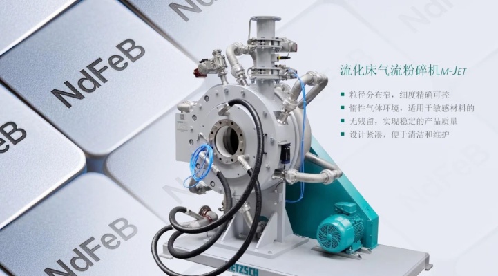 ?耐馳m-Jet高能量流化床氣流磨是專(zhuān)為稀土磁粉(如釹鐵硼)的干法精細(xì)研磨而設(shè)計(jì)的。其出料粒度分布窄,細(xì)度精確可控,可確保始終如一的高質(zhì)量產(chǎn)品 - 這是高性能磁性材料的關(guān)鍵因素。其可在惰性氣體環(huán)境下處理易燃易爆的釹鐵硼粉末,實(shí)現(xiàn)更小的粒徑及更加均勻的粒度分布,并具有很好的成品穩(wěn)定性。新設(shè)計(jì)的氣流磨m-
