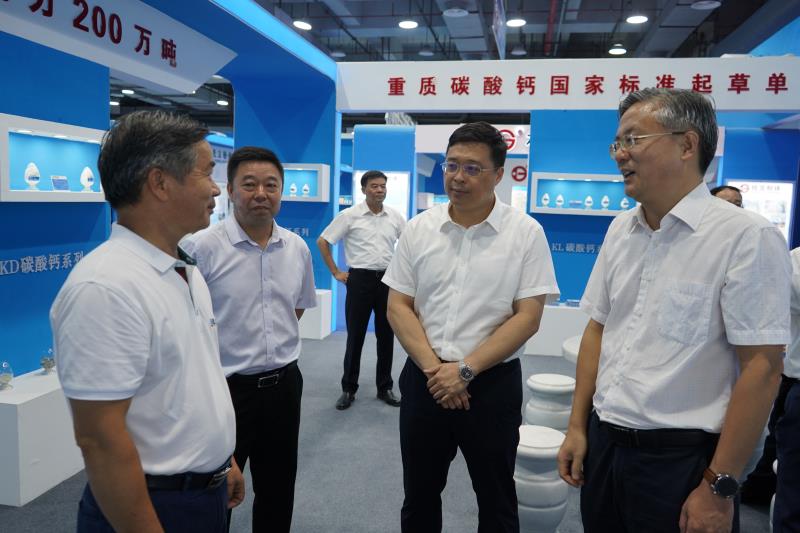 7月22日上午,廣西壯族自治區政府副主席周紅波在賀州市市長林冠、平桂區區長朱建軍、旺高工業區管委會主任鄒雪群的陪同下,到廣西東融石材碳酸鈣交易中心考察。期間,周紅波一行來到科隆展位,科隆公司副總經理陸元鴻接待了周洪波一行。