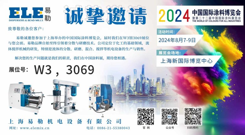 ?涂料行業(yè)盛會,中國涂料工業(yè)協(xié)會主辦的2024中國國際涂料博覽會,2024年8月7-9日在上海新國際博覽中心舉行。15000平規(guī)模,10萬+專業(yè)觀眾,8000+展商,30+專業(yè)論壇。 上海易勒機電設備有限公司應邀參展,展位號:W3館,3069號,屆時會有砂磨機,籃磨機,實驗室設備,多功能設備,成套生產