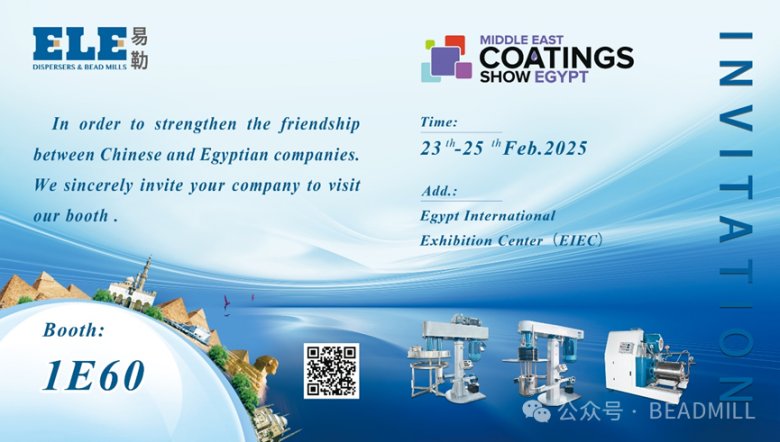 ?一場匯聚前沿科技與創(chuàng)新成果的展會即將震撼登場!易勒為了深度挖掘中東地區(qū)的市場潛力,將亮相中東涂料展,此次誠邀您一同前往埃及,開啟這場涂料領域的探索之旅!EGYPT COATINGS SHOW展會時間:2025年2月23-25日展會地點:埃及國際展覽中心(EIEC)易勒展位號:1E60參展設備臥式砂磨