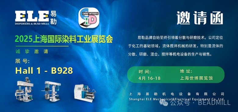 ?作為全球染化行業(yè)的“風向標”,第24屆中國國際染料工業(yè)及有機顏料、紡織化學品展覽會CHINA INTERDYE,2025年4月16-18日在上海世博展覽館舉行。本屆展會以“科技創(chuàng)新、綠色轉型”為主題,覽面積: 6.0萬㎡,展商數(shù)量: 620家。 上海易勒機電設備有限公司受邀參加,展位號:【Hall