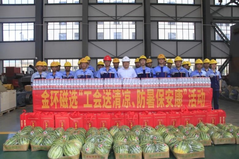 ?7月10日,集團公司黨委委員、董事、財務總監潘長福一行到金環磁選開展“工會送清涼、防暑保安康”活動,向一線員工表示親切慰問并送上防暑降溫物品。活動現場,潘長福與一線員工親切交談,詢問了他們的生活狀況和工作狀況,對一線員工高溫天氣下堅守崗位、辛苦勞動的精神表示高度贊揚,并親自把西瓜、涼茶、藿香正氣水等