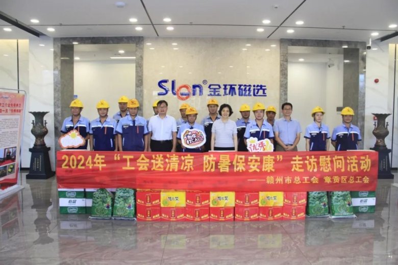 ?7月29日,贛州市人大常委會副主任、市總工會黨組書記、主席吳青一行到金環磁選開展“工會送清涼 防暑保安康”走訪慰問活動,并調研產業工人隊伍建設改革工作。活動現場,吳青向高溫天氣堅守崗位的一線職工致以問候,并親自送上礦泉水、飲料、綠豆等慰問品,叮囑大家要增強自我防護意識,做好防暑降溫、確保安全生產。同