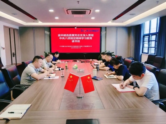 ?4月21日,金環磁選黨總支舉行深入貫徹中央八項規定精神學習教育讀書班暨理論學習中心組集體學習,公司黨總支副書記、總經理黃會春主持開班式并作總結講話。本次讀書班通過集中學習、個人自學、交流研討等多種形式,原原本本研讀《習近平關于加強黨的作風建設論述摘編》,重溫中央八項規定及其實施細則精神,并結合工作實