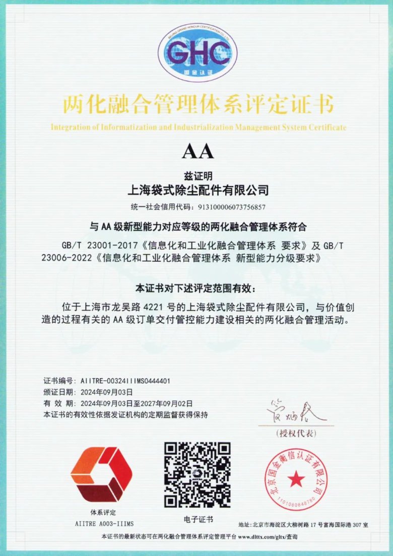 ?上海袋式除塵配件有限公司順利通過國家工業和信息化部《信息化和工業化融合管理體系 要求》(GB/T 23001-2017)及《信息化和工業化融合管理體系 新型能力分級要求》(GB/T23006-2022)體系認證,獲得AA級評定證書。“兩化融合”是“信息化”和“工業化”的高層次深度結合,是指以信息化帶