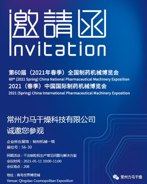 2021年5月10-12日,第60屆青島藥機展會在青島國際博覽中心舉行。常州力馬在制劑機械一館S6-30 展位,特邀著名教授和資深工程師為你答疑解難、贈書啟智。