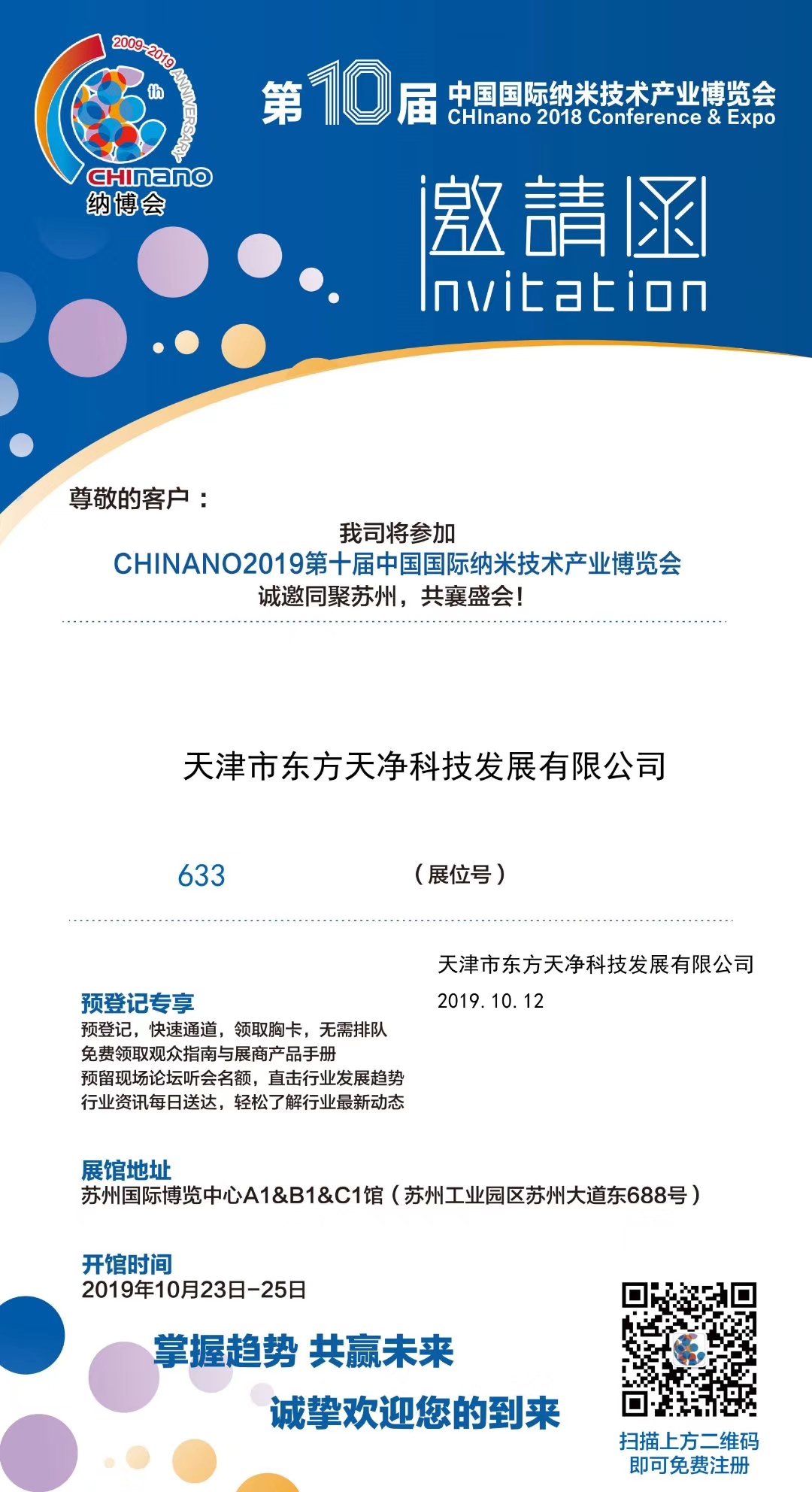 第十屆中國國際納米技術(shù)產(chǎn)業(yè)博覽會(huì)(The 10thCHInano Conference & Expo----CHInano 2019)將于2019年10月23-25日在蘇州國際博覽中心隆重舉辦。天津市東方天凈科技發(fā)展有限公司誠邀同聚蘇州,共襄盛會(huì)!