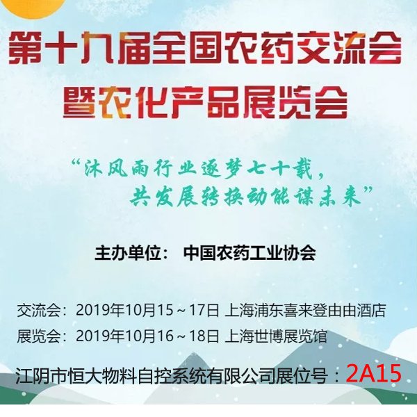 “沐風雨行業(yè)逐夢七十載,共發(fā)展轉(zhuǎn)換動能謀未來”。2019第十九屆全國農(nóng)藥交流會暨農(nóng)化產(chǎn)品展覽會、第四屆中國國際新型肥料展覽會定于10月16-18日在上海世博館舉辦。江陰市恒大物料自控系統(tǒng)有限公司歡迎您蒞臨展位:2A15,交流商洽!