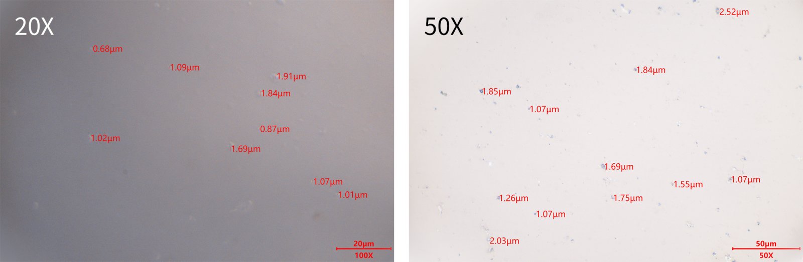 2、出料檢測 使用 ZYTR-80E Plus 三輥機壓力模式對材料進行研磨分散,通過電鏡分別在20倍和50倍狀態下測試,結果大部分細度<2μm,如下圖所示: