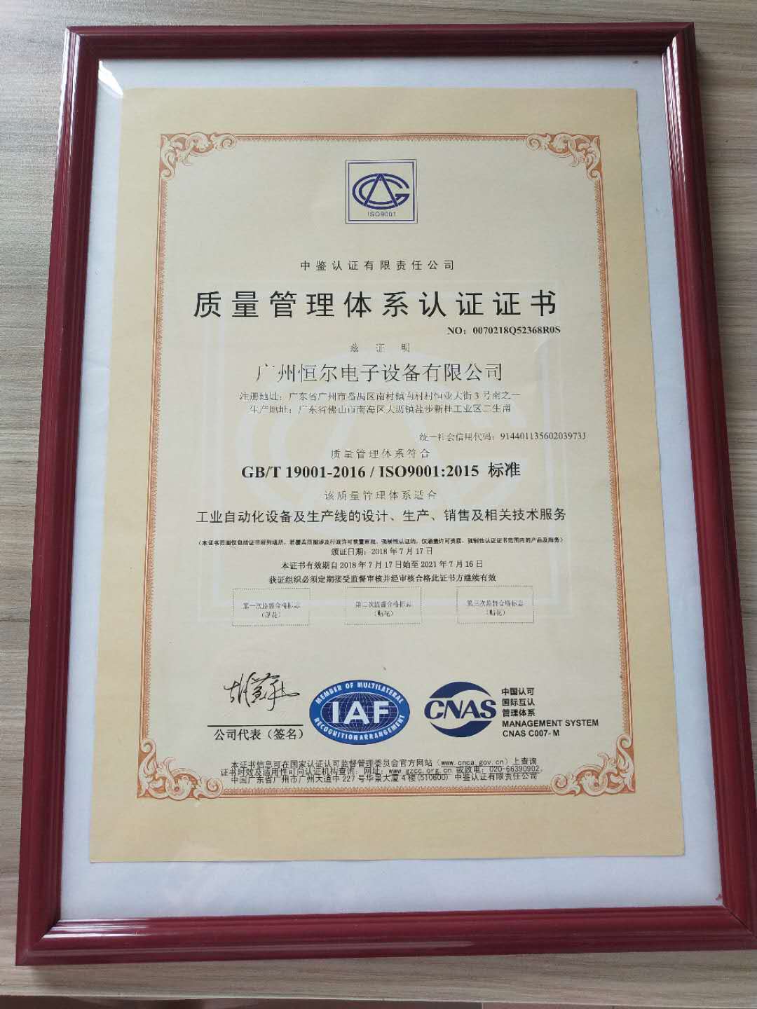 廣州恒爾電子設備公司順利通過GB/T 19001-2016/ISO9001:2015質量管理體系認證。 2018年7月10號,在以高級審核員為首的認證公司審核專員蒞臨我司進行審核,在公司專員的陪同下、全體員工的積極配合下,我司順利通過GB/T 19001-2016/ISO9001:2015質量管理體系認證,進一步證明了公司產品的高質量水平。
