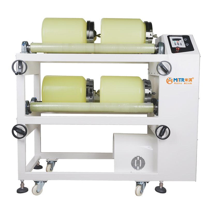 ●輥軸間距手輪調(diào)節(jié),防止罐體跑偏移動。