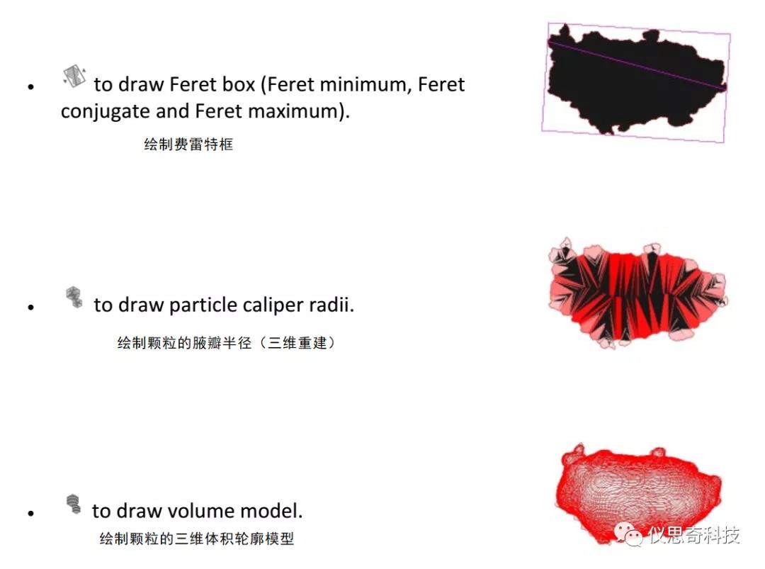形狀信息是對粒徑分布的二維的補充,比如大小相識的顆粒可能在形狀上大相徑庭。對非球形顆粒準確 的定性,兩維的形狀信息是必需的。形狀的差異可從粒形分布反映出來。動態圖像分析抓取最佳的顆粒圖像進行處理。得到的圖像可經過復雜的圖像分析程序分析,得到圖像信息。