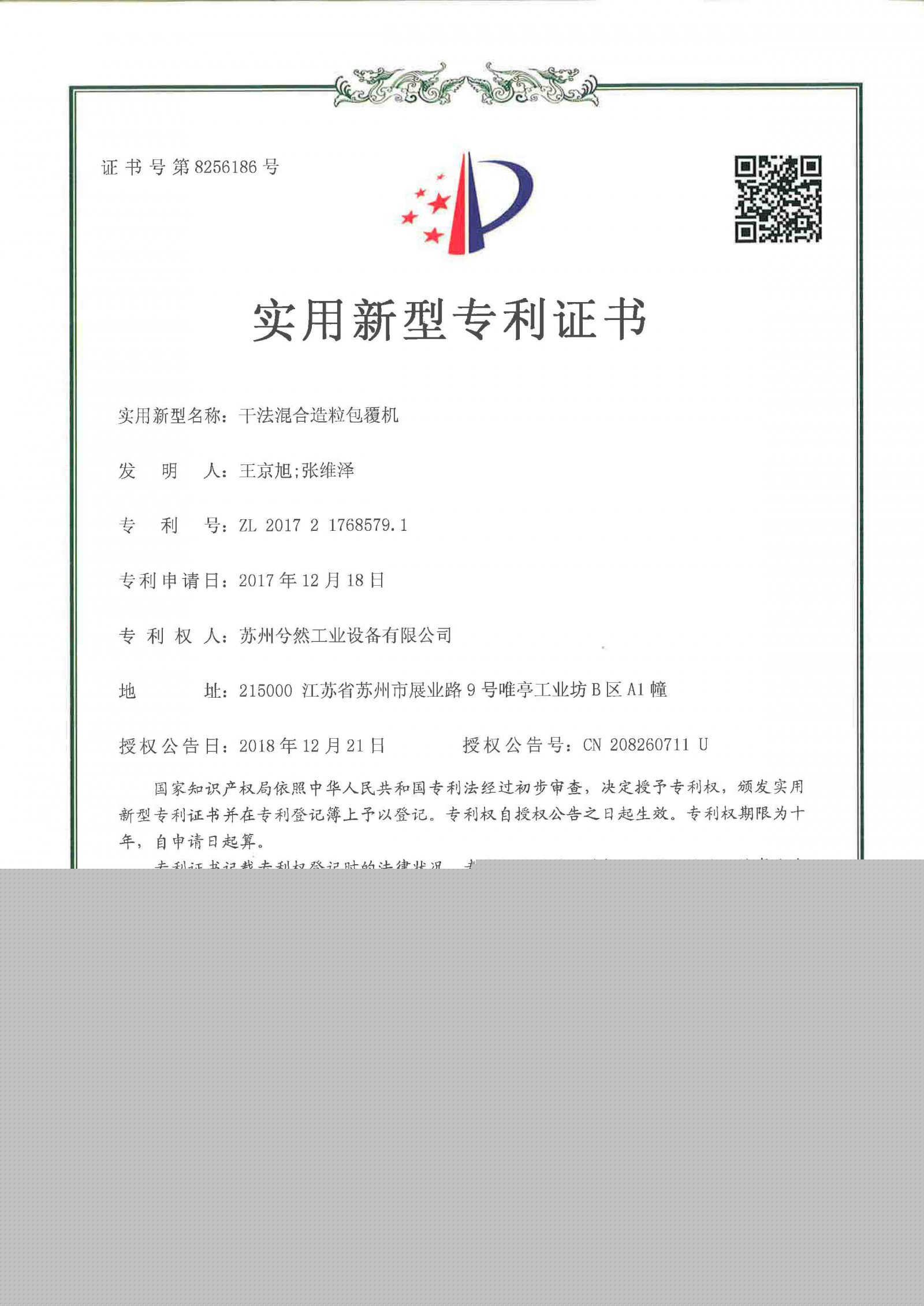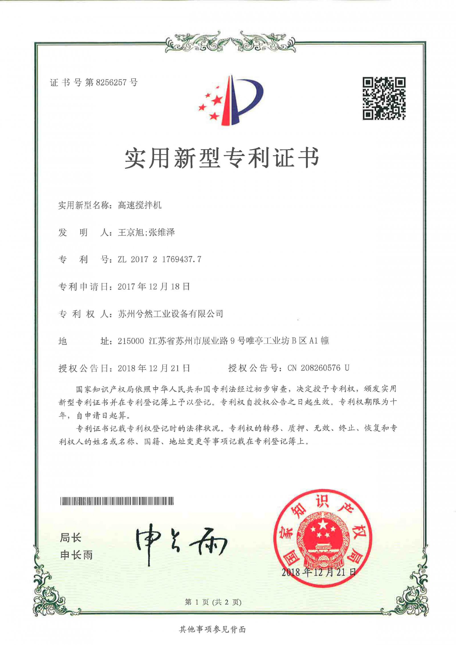 2019年1月16日,蘇州兮然工業設備有限公司拿到“干法混合造粒包覆機”、“用于超精粉研磨的磨盤”、“高速攪拌機”三個實用新型專利證書,公司的專利成員又進一步擴大了。蘇州兮然工業設備有限公司將繼續給客戶提供高技術高質量的產品。不斷提升自己的科技實力,為客戶帶來更好的產品體驗。