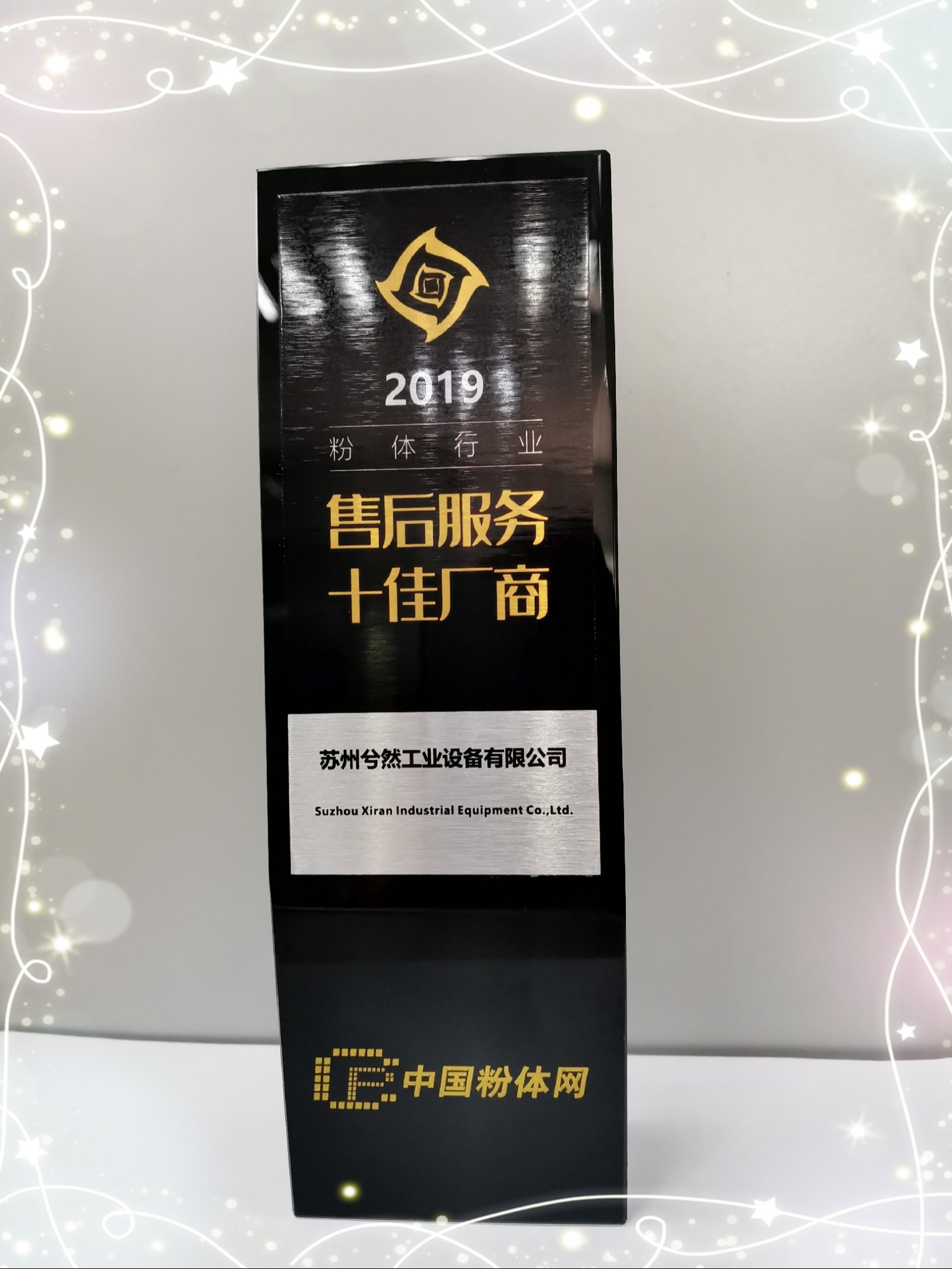 近日,中國粉體網(wǎng)2019年度獎項評選結(jié)果出爐,蘇州兮然工業(yè)設(shè)備有限公司榮獲2019粉體行業(yè)”售后服務(wù)十佳廠商”獎。