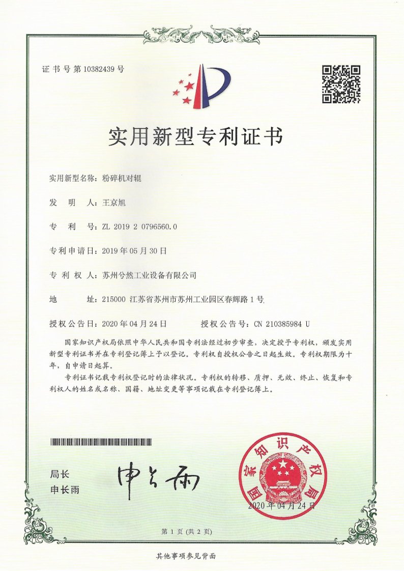 在2019年拿到“干法混合造粒包覆機”、“用于超精粉研磨的磨盤”、“高速攪拌機”三個實用新型專利證書之后,近日,蘇州兮然工業設備有限公司又喜獲“粉碎機對輥”、“粉碎機主軸氣密封裝置”和“粉碎機送料裝置”三項實用新型專利證書。蘇州兮然將繼續給客戶提供高技術高質量的產品,不斷提升自己的科技實力,為客戶帶來更好的產品體驗。