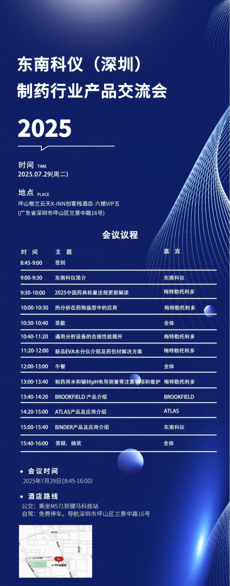 ?東南科儀(深圳)制藥行業產品交流會在INN創客棧酒店圓滿舉辦,會議邀請了瑞士梅特勒托利多、美國阿美特克ATLAS的代表為我們演講分享及品牌產品介紹,現場還對德國BINDER、美國阿美特克BROOKFIELD、德國IKA等品牌產品進行介紹,展示制藥行業的解決方案。儀器展示現場展示了瑞士梅特勒托利多的天