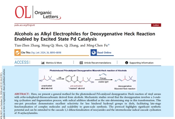?第一作者:張?zhí)煺? 通訊作者:付明臣文章名稱:《Alcohols as Alkyl Electrophiles for Deoxygenative Heck Reaction Enabled by Excited State Pd Catalysis》影響因子:4.9付明臣老師課題組合肥工業(yè)大學1