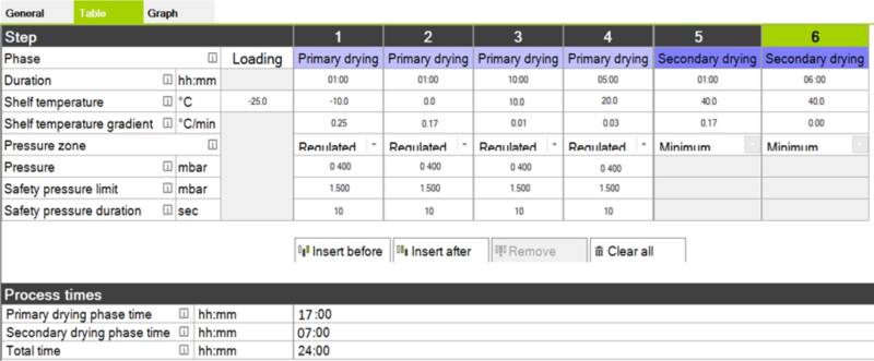 冷凍干燥過程是在裝載步驟開始的,需要設(shè)置隔板溫度,例如 -25°C,因為樣品在冷凍柜中凍結(jié)。通過將隔板保持在與樣品相同的溫度,可以最大限度地減少由于傳熱而導(dǎo)致的樣品熔化,并且可以確保均勻干燥。在干燥過程中,隔板溫度從 -10°C 逐漸升高到 40°C,以方便樣品中水的升華。為了保持最佳升華效率和防止樣品坍塌,在整個初級干燥過程中,壓力保持在 0.300mabr 的恒定水平。