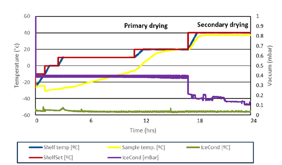 在二次干燥階段,壓力被最小化,以實現(xiàn)低水分含量的最終產(chǎn)品。這一步是實現(xiàn)穩(wěn)定性和產(chǎn)品保質(zhì)期的關(guān)鍵,通過解吸去除任何殘留的水分,可能會導(dǎo)致降解或變質(zhì)。詳細信息見圖2。
