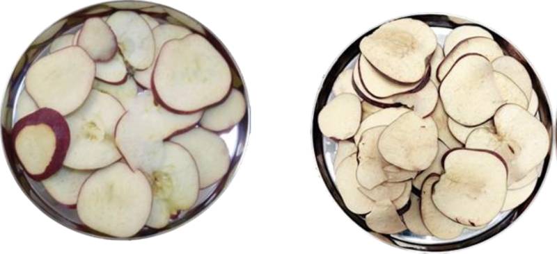 ▲ 圖4. 蘋果切片冷凍干燥前(左)和冷凍干燥后(右)。