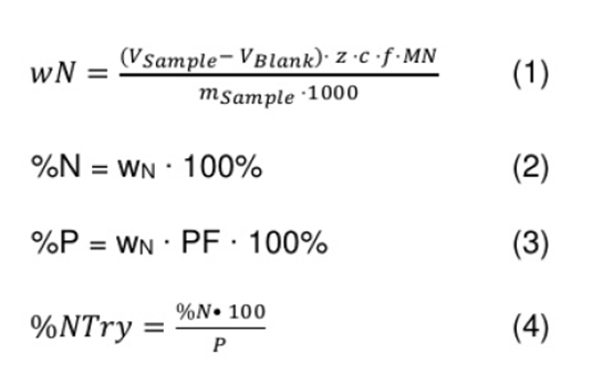 結果以氮的百分比計算得出。為了計算樣品中的蛋白質含量,需將氮含量乘以特定樣品的蛋白質系數。以下公式(1)、(2)和(3)用于計算結果。