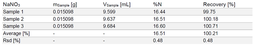 表2:硝酸鈉中氮回收率結(jié)果