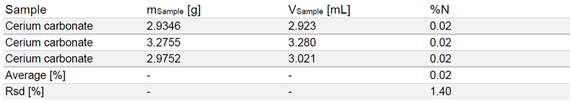 本文介紹了一種使用戴氏合金法測定碳酸鈰中的氮含量的簡便可靠方法。該方法通過凱氏定氮儀 MultiKjelK-365 測定硝酸鹽、亞硝酸鹽和氨氮的總和。實(shí)驗(yàn)結(jié)果與預(yù)期值高度吻合,相對標(biāo)準(zhǔn)偏差(RSD)低。