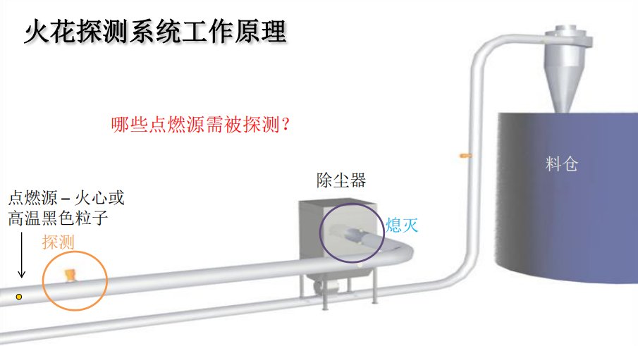 火花探測和熄滅可探測通過氣動管道和輸送機傳送到其他材料處理設備、可能成為火災或爆炸火源的熱顆粒、火花和火焰。 進入處理可燃粉塵的粉塵收集器的一些熱顆粒足以導致粉塵爆炸。 被輸送到筒倉的陰燃可燃固體會成為大火的火源。