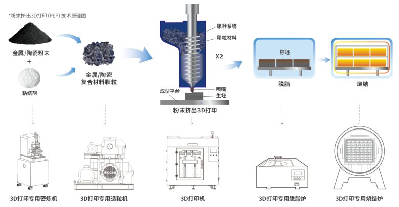 ▲粉末擠出打印(PEP)技術原理及工藝鏈設備說明