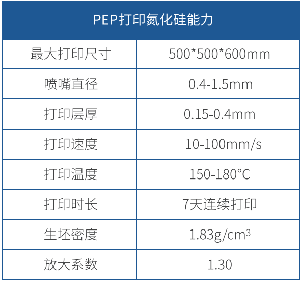 升華三維還明確了PEP打印氮化硅陶瓷的一系列關鍵參數,如層厚、擠出直徑等,為實際生產提供了精確的操作指引,確保了打印過程的高效與精準。