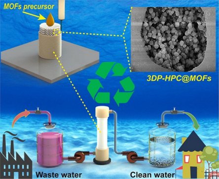 中國科學院蘭州化學物理研究所研究員王曉龍團隊與蘭州大學副教授周林成團隊合作,結合3D打印技術在復雜器件構筑及自由設計、制造與成型等領域的優勢,開展了3D打印MOFs修飾的多孔陶瓷催化材料與器件研究,用于水體有機污染物催化降解。